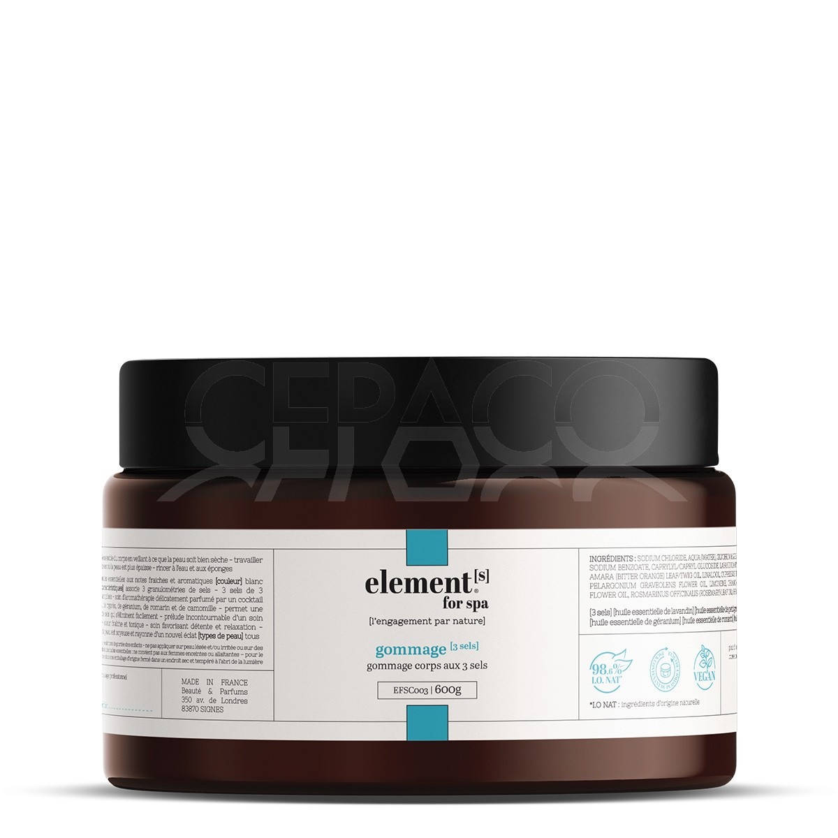 [texture] gommage aqueux [odeur] mélange d’huiles essentielles aux notes fraiches et aromatiques [couleur] blanc [types d’actif] exfoliant, détoxifiant, relaxant [caractéristiques] associe 3 granulométries de sels - 3 sels de 3 provenances : Himalaya, Mer Morte et salines françaises - soin d’aromathérapie délicatement parfumé par un cocktail d’huiles essentielles de lavandin, de petit grain, de cyprès, de géranium, de romarin et de camomille - permet une exfoliation du corps grâce aux particules fines de sels qui s’éliminent facilement - prélude incontournable d’un soin corporel [effets] exfoliation douce et relaxante - odeur fraîche et tonique - soin favorisant détente et relaxation - débarrassée de ses impuretés et cellules mortes, la peau est soyeuse et rayonne d’un nouvel éclat [types de peau] tous