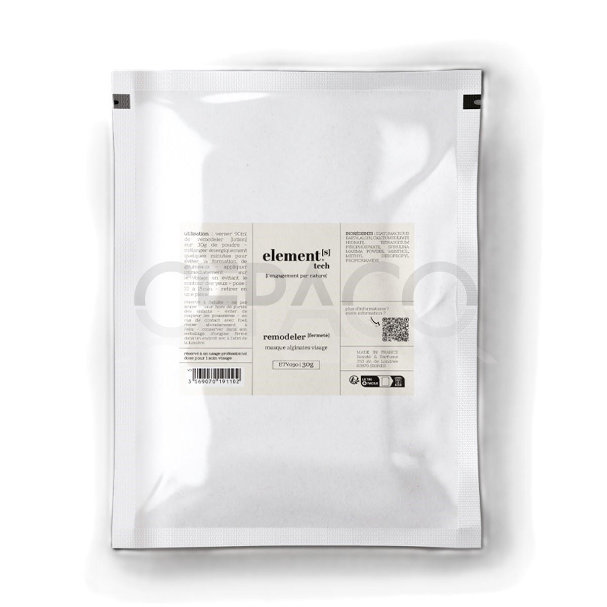 Le masque remodeler [fermeté] associé au remodeler [lotion] donne un masque remodelant et raffermissant à base d'alginates pour tous les types de peaux. La poudre d'alginates se dilue avec la lotion remodelante pour former un masque gélifié qui se retire comme un masque peel-off.